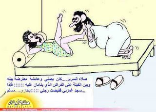 جبريل(أكبر): نعم ، كانت عائشة تتعرى أمام الرجال من وراء الستائر الشفافة (38) ، وكان محمد يكثر من النوم على فخذها أمام الصحابة و التابعين (39) . فمن الواضح أن محمد كان يميل للأفخاذ ، فعلى أفخاذ خديجة أتى برهان الوحي و على أفخاذ عائشة كان يستريح.