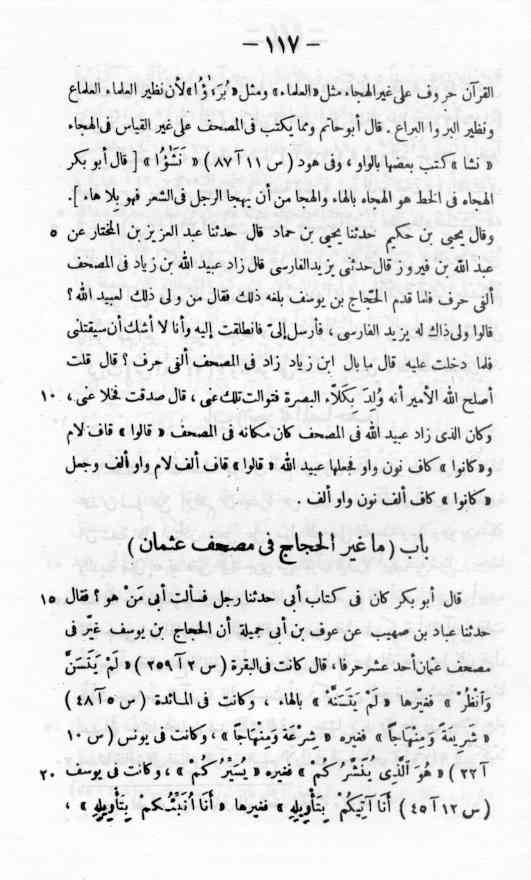وبعد سنوات من مقتل عثمان، أراد أركان الدولة الأموية التأكيد على النسخة العثمانية، فقرر الخليفة مروان بن الحكم حرق نسخة حفصة، التي أُعيدت إليها بعد تحرير لجنة عثمان، بيد أنها رفضت تقديمها للحرق، وبعد وفاتها أخذها الخليفة مروان وأتلفها. أما الحجاج بن يوسف الذي عمل على خدمة الدولة الأموية بإخلاص، فإنه أمر بإجراء تعديلات على النص القرآني العثماني في أحد عشر موضعاً، ويوردها السجستاني في «كتاب المصاحف» (انظر الصورة المرفقة أدناه). وهنا، علينا ألا نغفل حقيقة أن الحجاج كان يدير ولاية العراق المشتعلة بالثورات، ولربما كانت بعض نسخ القرآن غير العثمانية منتشرة بين العراقين الذين كانوا يأبون الخضوع لبني أموية.