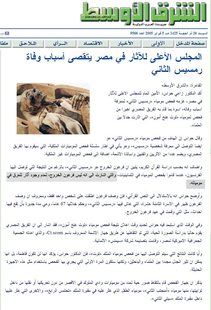 واضاف انه بحسب دراسة القرآن الكريم، يتبين ان فرعون الخروج هو «رمسيس الثاني»، بالرغم من النتيجة التي توصل اليها الفرنسيون، عندما قاموا بفحص المومياء في الثمانينيات، والتي اشارت الى انه ليس فرعون الخروج، لعدم وجود آثار للغرق في موميائه.