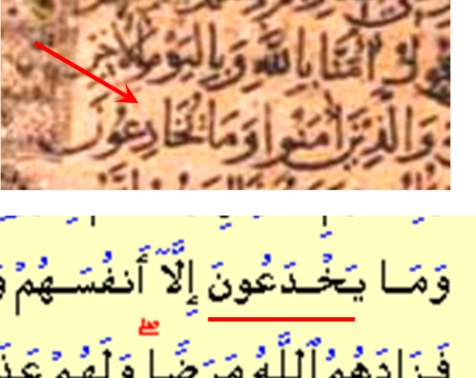 بينما هي يخدعون في القرآن الحالي: وَمَا يَخْدَعُونَ إِلَّا أَنْفُسَهُمْ