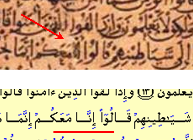 السطر 11: وَإِذَا خَلَوْا إِلَى شَيَاطِينِهِمْ قَالُوا ؟؟ مَعَكُمْ إِنَّمَا نَحْنُ مُسْتَهْزِئُونَ (؟؟ مساحة معتمة لا تكفي لوضع لفظة “إنا“)