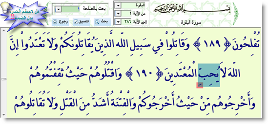 ولكنها وردت في برنامج الباحث : « وَقَاتِلُواْ فِي سَبِيلِ اللّهِ الَّذِينَ يُقَاتِلُونَكُمْ وَلاَ تَعْتَدُواْ إِنَّ اللّهَ لاَ يُحِبِّ الْمُعْتَدِينَ »