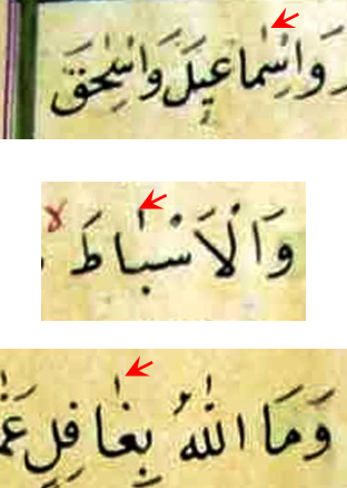 (4) من الملاحظ إنه في هذه المخطوطة خالف الخطاط العرف المتبع بأن الألف الخنجرية تحل مكان ألف المد في التعديل المضاف على الرسم العثماني ، فقرر الخطاط ان يضيف الألف الخنجرية بجانب ألف المد في الكثير من الكلمات فصارت تحوي على ألفين مثل: