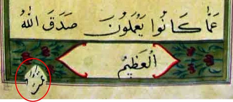 صفحة المخطوطة المعروضة من (سورة البقرة) ، وترجع إلى القرن ال13 هـ (1298 هـ ) كتبها الخطاط “علي رقيق” وأهداها إلى مكتبة الملك عبد العزيز بالمدينة المنورة ، ونلاحظ فيها الآتي