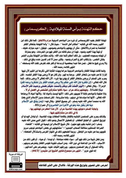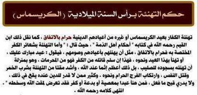 ” تهنئة الكفار بعيد الكريسماس وبأعيادهم الدينية حرام بالإتفـــــاق كما نقل ذلك إبن القيم فى كتابه أحكام أهل الذمة …..” ويستطرد الكاتب أسباب حرمة تهنئتنا معشر الكفار بالأعياد والمناسبات وكيف أن ذلك إثم كبير ومداهنة ويمكنك مطالعة النص المرفق لقراءة التكفير