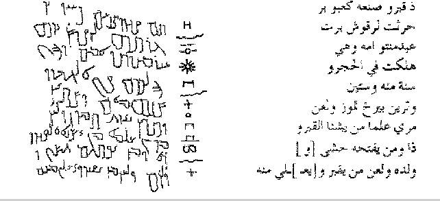 الكتابة على يسار المخطوطة عبارة عن خليط من النبطية والعربية التي ليس بها أي نقاط أو علامات ترقيم. والكتابة العمودية إلى يمينها هي كتابة ثمودية. والكتابة التي على يمين الصورة هي فك تلك الرموز النبطية والعربية إلى اللغة العربية المعاصرة. ويظهر من هذه المخطوطة أن اللغة العربية لم تكن لغة مكتوبة كما هي اليوم.