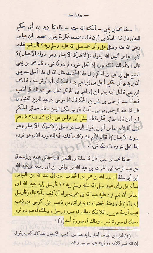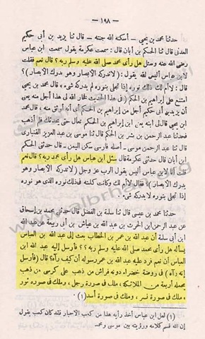 أن عبد الله بن عمر بن الخطاببعث إلى عبد الله بن العباس يسأله : هل رأى محمد – صلى الله عليه وسلم – ربه ؟ فأرسل إليه عبد الله بن العباس : أن نعم . فرد عليه عبد الله بن عمررسوله أن كيف رآه ؟ فأرسل إليه أنه رآه في روضة خضراء دونه فراش من ذهب على كرسي من ذهب تحمله أربعة من الملائكة . ملك في صورة رجل ، وملك في صورة ثور ، وملك في صورة نسر ، وملك في صورة أسد