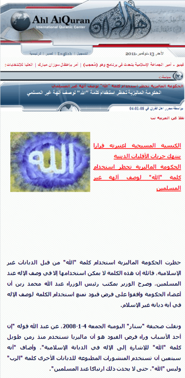اسم الجلاله هذا هو معبود المسلمين وحدهم فقط لا غير واسم الههم وحدهم فقط لا غير .. والمسلم سواء كان هندي او صيني او امريكي او ايا كان لا يصلي الا لهذا الاسم الله – ALLAH ! وها هي الحكومة الماليزية تحظر استخدام كلمة “الله” لوصف آلهة غير المسلمين