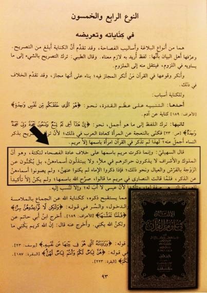 · “ ترك اللفظ إلى ما هوأجمل نحو {إن هذا أخي له تسع وتسعون نعجة ولي نعجة واحدة} فكنى بالنعجة عن المرأة كعادة العرب في ذلك لأن ترك التصريح بذكر النساء أجمل منه ولهذا لم يذكر في القرآن امرأة باسمها إلا مريم. قال السهيلي : وانما ذكرت مريم بإسمها على خلاف عادة الفصحاء لنكته وهو أن الملوك والأشراف لا يذكرون حرائرهم في ملً ولا يبتذلون أسماءهن بل يكنون عن الزوجة بالفرش والعيال ونحوذلك فإذا ذكروا الإماء لم يكنوا عنهن ولم يصونوا أسماءهن عن الذكر فلما قالت النصارى في مريم ما قالوا صرح الله باسمها ولم يكن سوى تأكيدًا للعبودية التي هي صفة لها وتأكيدًا لأن عيسى لا أب له وإلا لنسب إليه..” . ( الإتقان في علوم القرآن – السيوطي – النوع الرابع والخمسون في كناياته وتعريضه – ج2 ص 93 ).