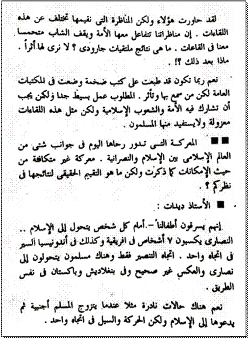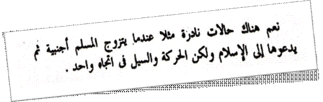 ولن يفوتنا قوله عن نكاح المسلمين للأجنبيات لدعوتها للإسلام بأنه من الحالات النادرة .. ” ولكن الحركة والسيل في اتجاه واحد ” ويقصد في اتجاه المسيحية ونجاحها بالانتشار !!